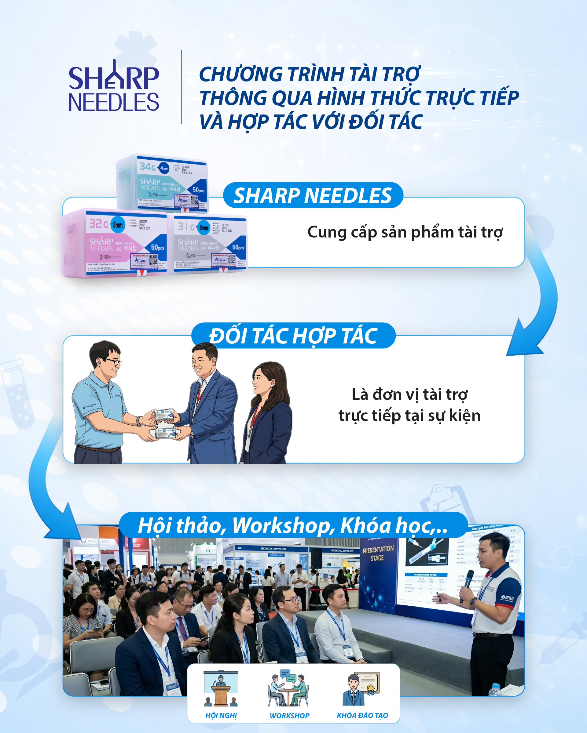 Sharp Needles triển khai linh hoạt các hình thức tài trợ, bao gồm cả việc cung cấp sản phẩm trực tiếp và phối hợp cùng các đơn vị đối tác tại sự kiện. Chúng tôi đóng vai trò là nguồn lực hỗ trợ quan trọng, cung cấp sản phẩm tài trợ cho các đơn vị đang trực tiếp tài trợ tại các hội thảo, workshop và khóa đào tạo chuyên môn.
