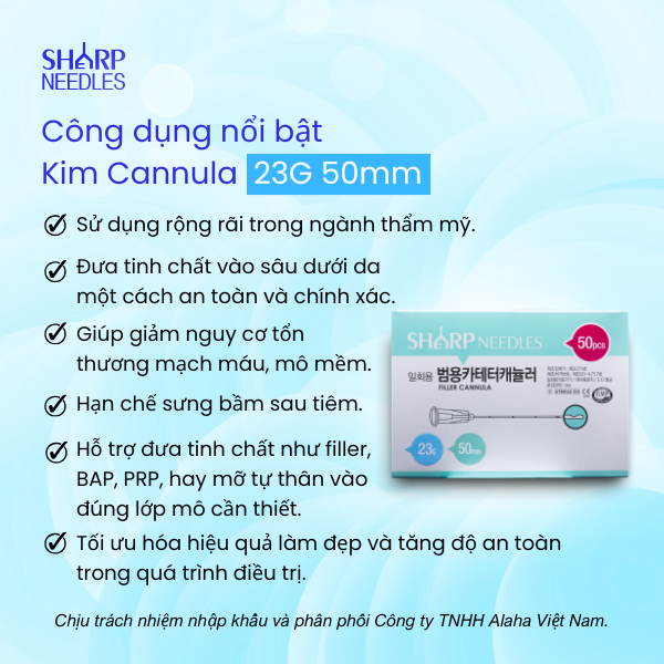 Kim cannula 23G được sử dụng rộng rãi trong ngành thẩm mỹ nhờ vào khả năng đưa tinh chất vào sâu dưới da một cách an toàn và chính xác. Với thiết kế đầu tròn, kim giúp giảm nguy cơ tổn thương mạch máu, mô mềm, từ đó hạn chế sưng bầm sau tiêm. Ngoài ra, kim còn hỗ trợ đưa tinh chất như filler, BAP, PRP, hay mỡ tự thân vào đúng lớp mô cần thiết, giúp tối ưu hóa hiệu quả làm đẹp và tăng độ an toàn trong quá trình điều trị.