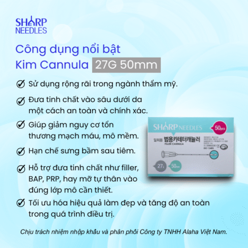 Kim cannula 27G được sử dụng rộng rãi trong ngành thẩm mỹ nhờ vào khả năng đưa tinh chất vào sâu dưới da một cách an toàn và chính xác. Với thiết kế đầu tròn, kim giúp giảm nguy cơ tổn thương mạch máu, mô mềm, từ đó hạn chế sưng bầm sau tiêm. Ngoài ra, kim còn hỗ trợ tinh chất như filler, BAP, PRP, hay mỡ tự thân vào đúng lớp mô cần thiết, giúp tối ưu hóa hiệu quả làm đẹp và tăng độ an toàn trong quá trình điều trị.